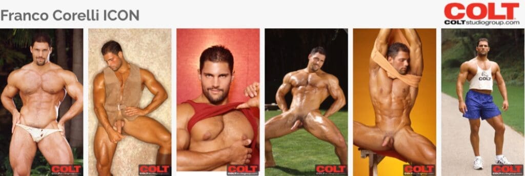 Now, Franco Corelli’s image of him in a torn thong is what teasing is made of! He looks like the man of your dreams you hope to meet on vacation and seduce after a few drinks. His stats on the Colt site are those of a towering 6’2 man with 9 inches of muscle meat. He was featured in the Minute Man 19 video released by Colt, and man, do I need to locate that now! Teaser below!