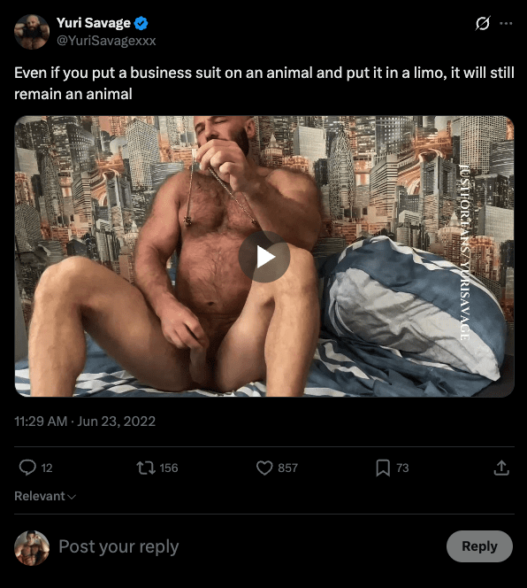 My friends love the phrase “Don’t Yuck My Yum.” So know I am not here to shame Yuri but rather talk about what he has been up to. While he has had a fascination with inanimate objects (Yuri, don’t come for me!), luckily for us he has now moved onto humans. Including men. I recently came across some clips of him where he is clearly shown sucking cock, cum eating, and being a muscular hairy bottom. For some content, check out his Twitter where he coins the nickname Yuri Savage.